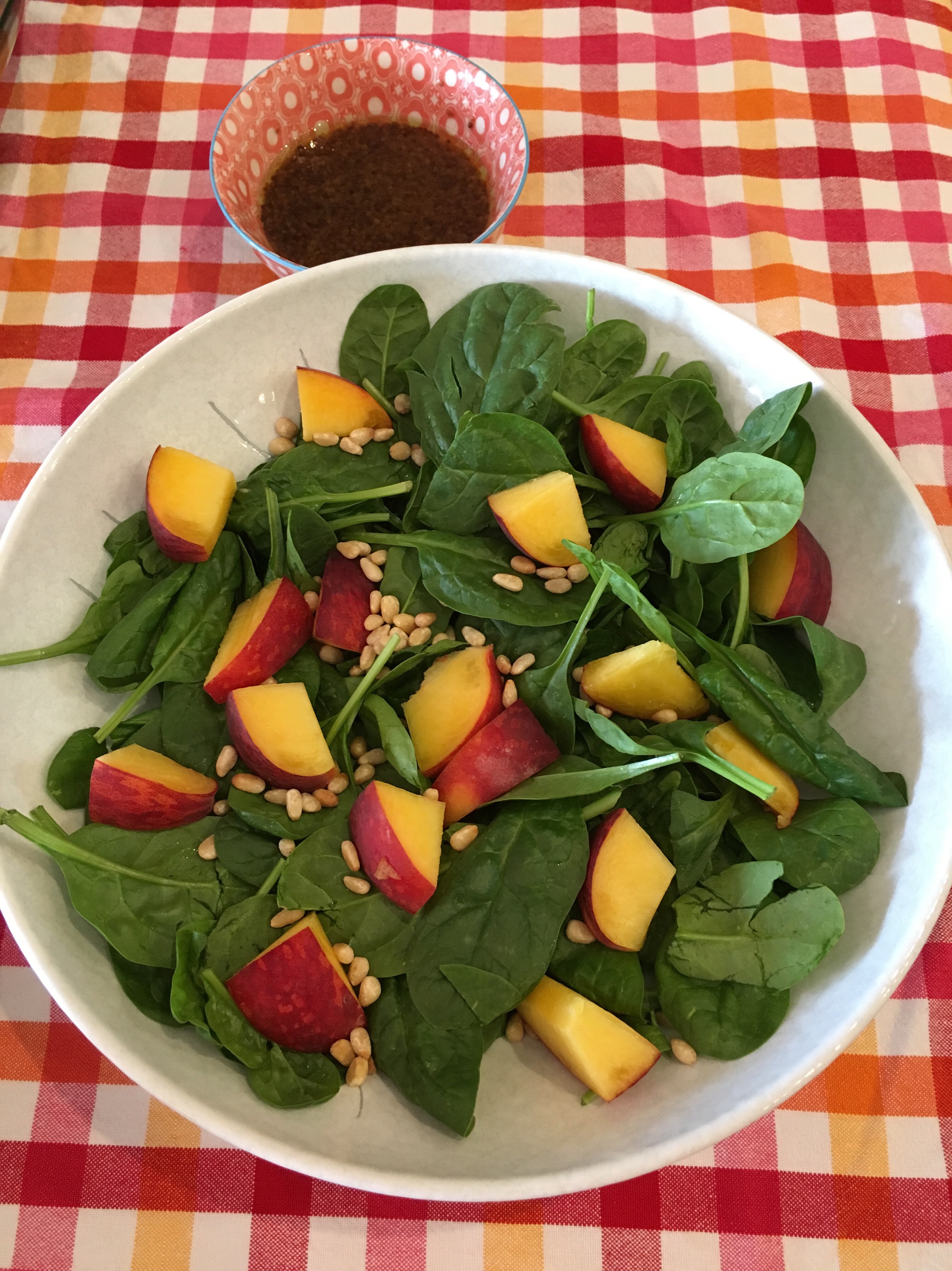 Spinach and peach salad. Easy peasy one with a mustard, honey and lime dressing.