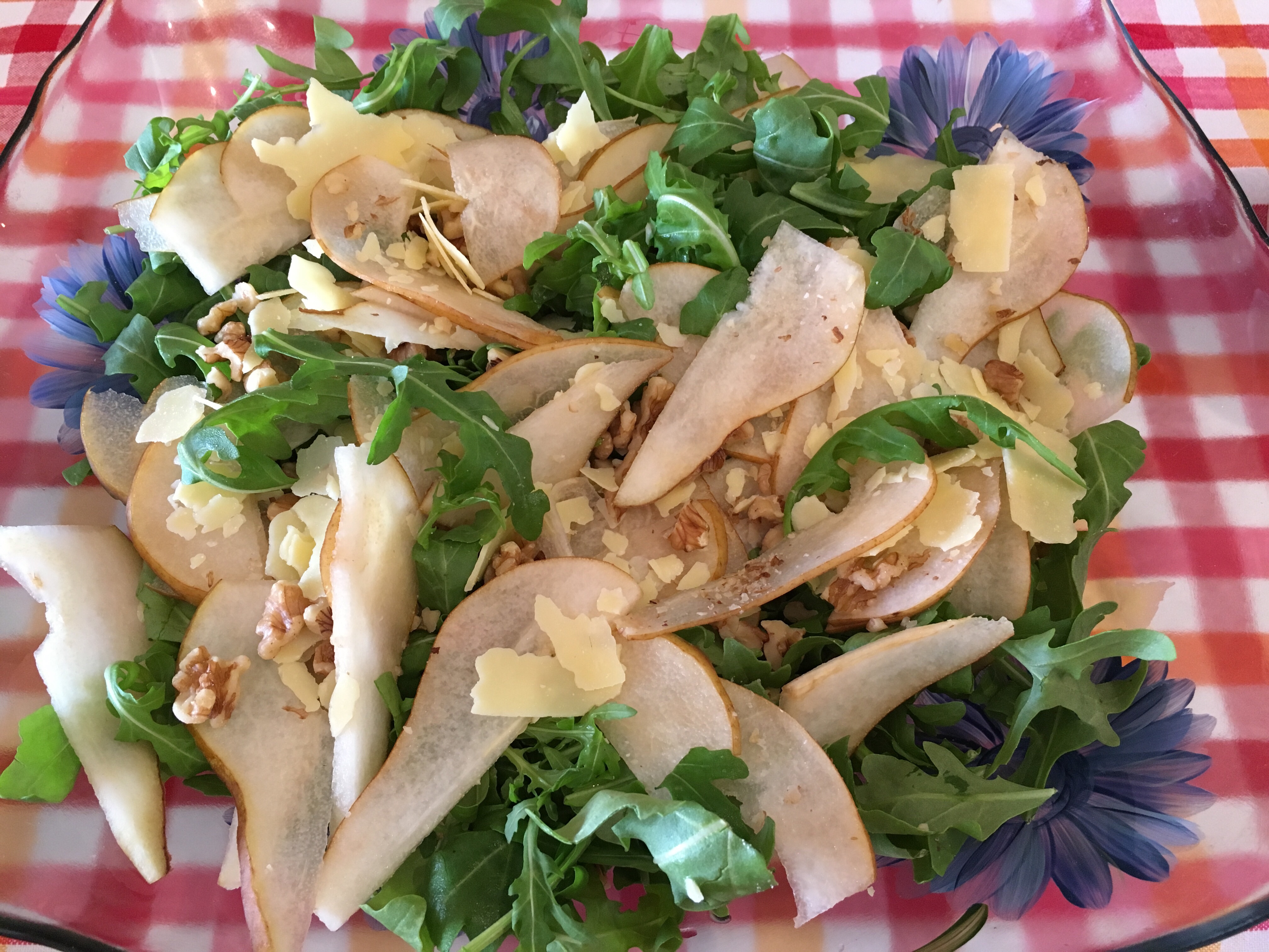 Pear, rocket, Parmesan and walnut salad with a balsamic dressing.