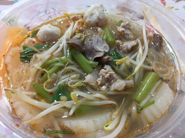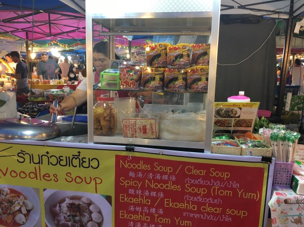 Very happy. Found a noodle soup stall. She had a pot with two flavours. One clear soup and one with tom yum.