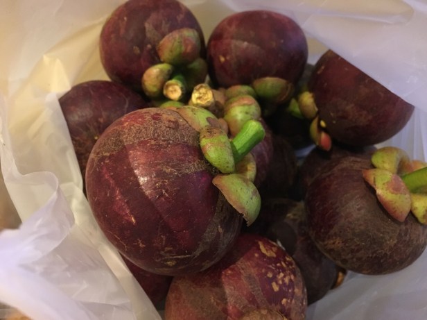 On the way home we bought more fruit. These are mangosteen and was 350 baht a kilo.