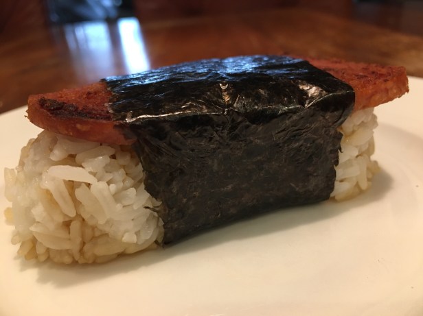 It’s rice , pan fried Spam ham and seaweed. The sauce is 1/4 cup of sugar, 1/4 cup Kikkoman soy and 1/8 cup of brown rice vinegar into a pot on stove until sugar is dissolved.
