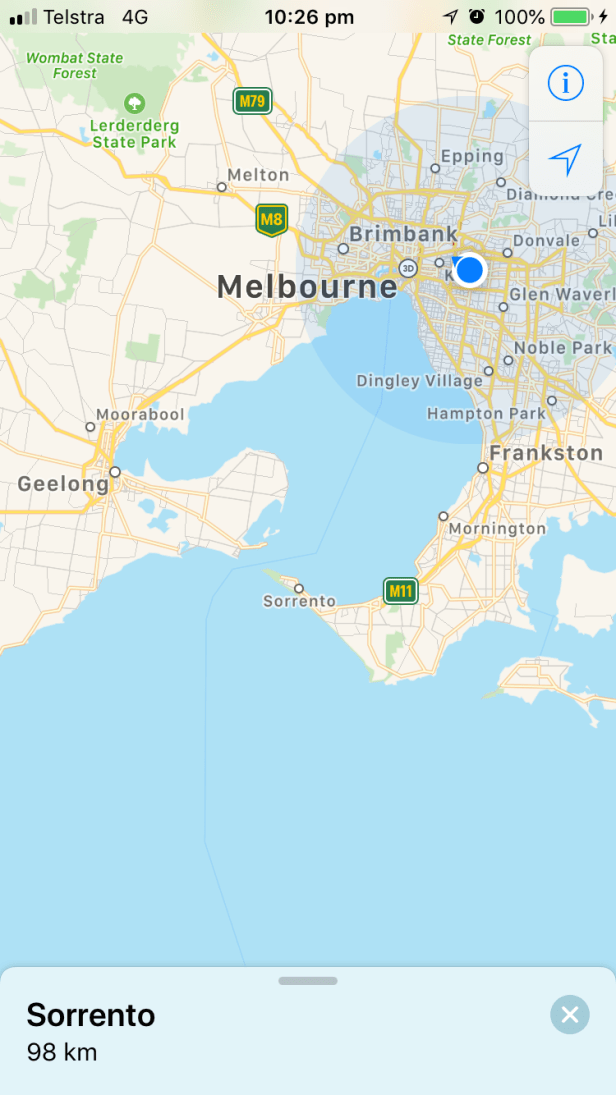 The blue dot is where I am now. Tomorrow I’ll drive down to Ocean Grove which is past Geelong.
