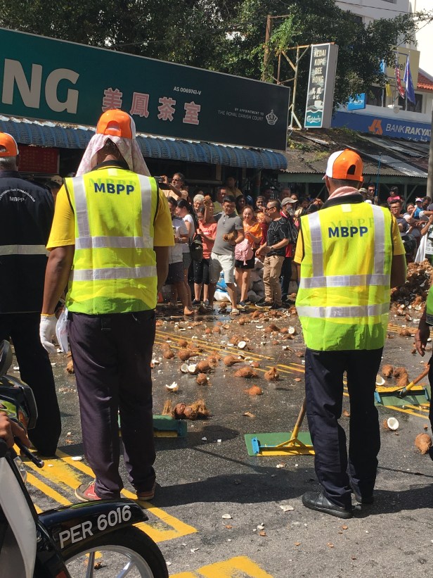 People were throwing coconuts on to the ground. Then the tractor would crush them and the clean up crew would come in.