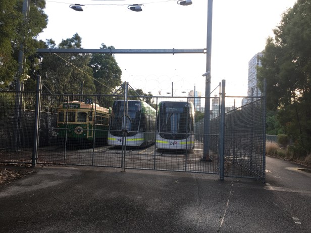 The tram depot. Trams still asleep. This was the yucky bit. One side was tracks. You can’t get down to street level. The other a high wire fence.