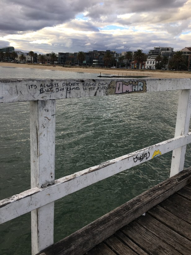 So I walked out to the pier found a bench and sat down. At least there I can escape. Only to find this. It’s like someone knew I needed help today. It’s particularly dark right now.
