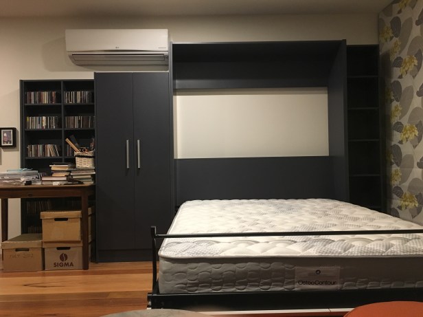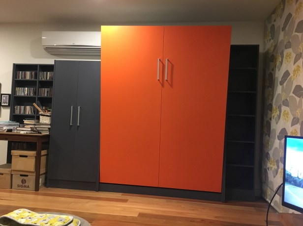 The problem is the bed frame was too small. So what happened? The installer matched the book shelves to the frame thinking the factory got it wrong.