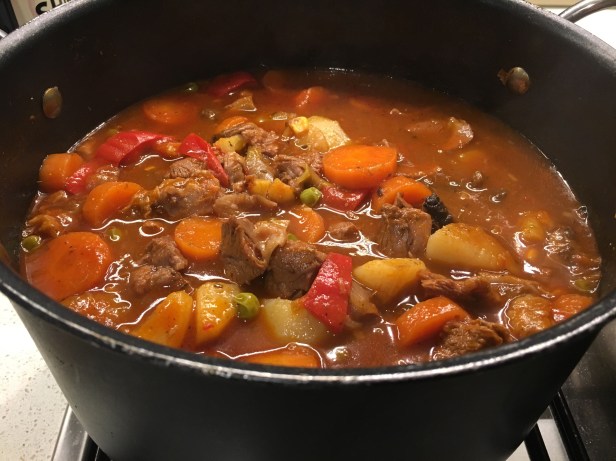 Left overs lamb roast that I converted into a lamb stew. Tastes okie. Had to add some ginger, fish sauce to it. In it is potatoes, carrots, capsicum, tomatoes, onion, garlic, peas and corn, leek, mushroom, thyme, rosemary, stock, red wine..