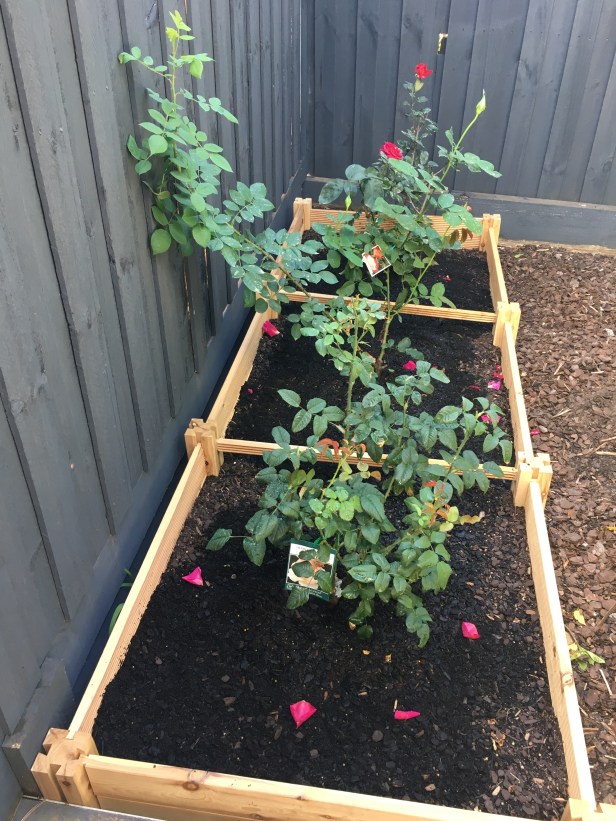 My roses are in. Only waiting for the trellis. The two bushes furthest away are climbing roses.