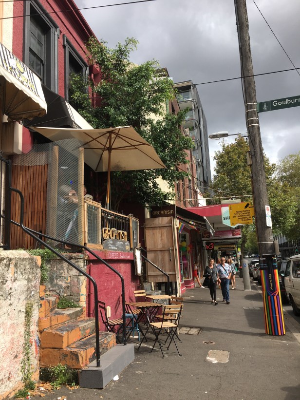 Then it was on to coffee. We were going to have it across the street. They couldn’t be bothered to take our order. So when Mr Wanderer spotted 2 ladies about to leave we climbed the steps and scored two stools and sat up at Organism to have our coffee and people watch.