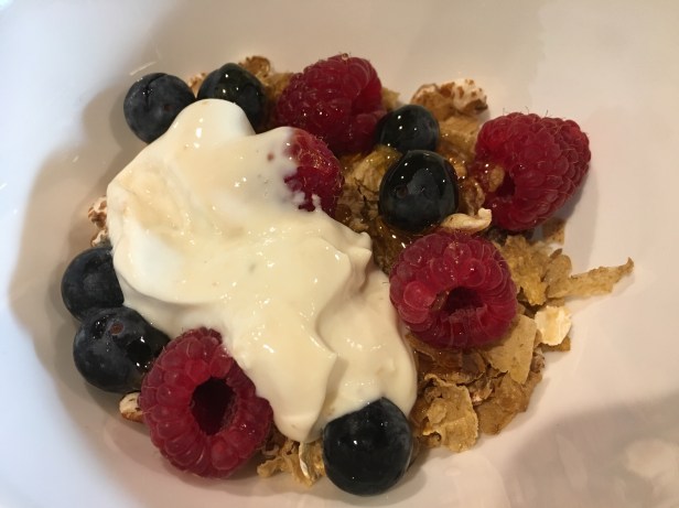 Breakkie is cereal, berries, honey, yoghurt and milk. He has his with bananas as well. I’ll make an instant coffee for me and an English breakfast for him.