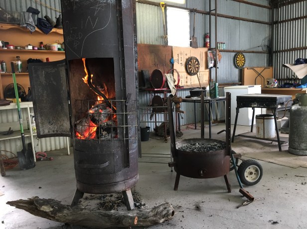 Our living quarters. Fire to keep warm. Coal then get transferred to the round thingy for camp oven cooking.