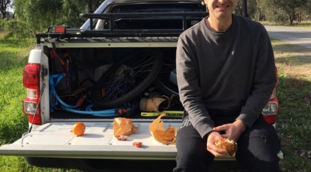 And since the sun was shining ..kind of ..we sat out the back. I supplemented our pies with fruits and a cuppa. It was freezing cold.