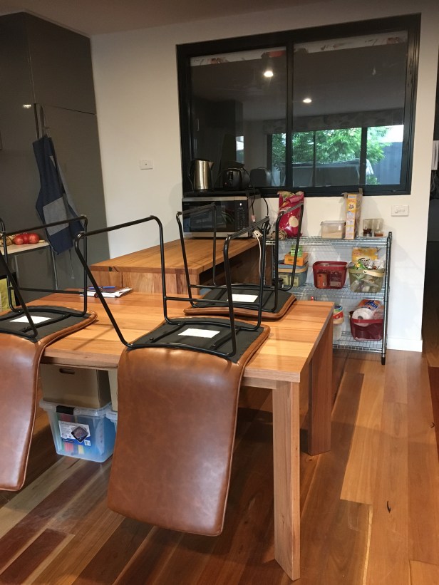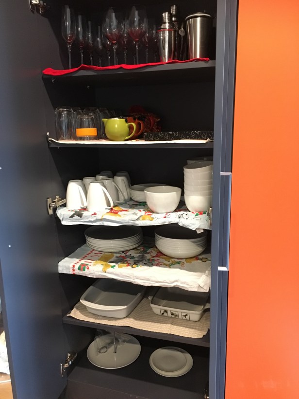 I’ve also cleared out my stationery/books cupboard to house my crockery. My books will go on to the wall divider in a few months. At the moment I’ve stashed them in boxes under the dining table.