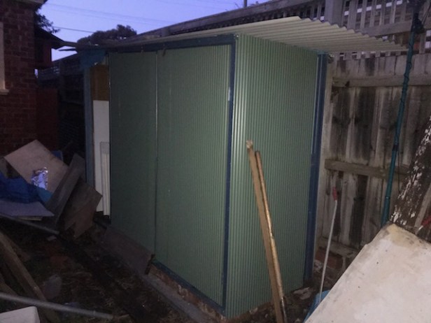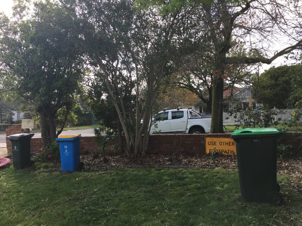 Facing the street! Rubbish bins! The left one is for household rubbish. Blue is recyclables. Light green lid is garden waste and composts etc