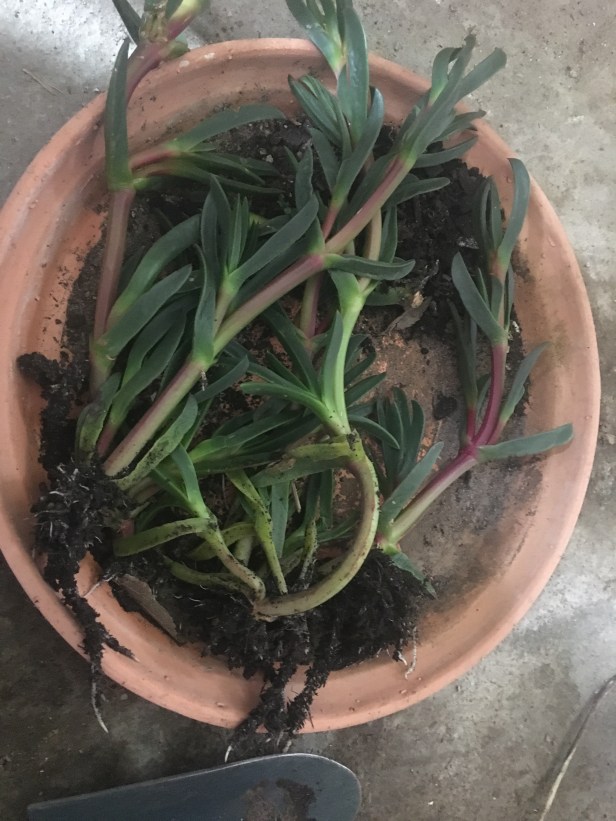 I weeded and he helped me moved a tree root and concrete slabs! We are only half done as we ran out of pig faces.