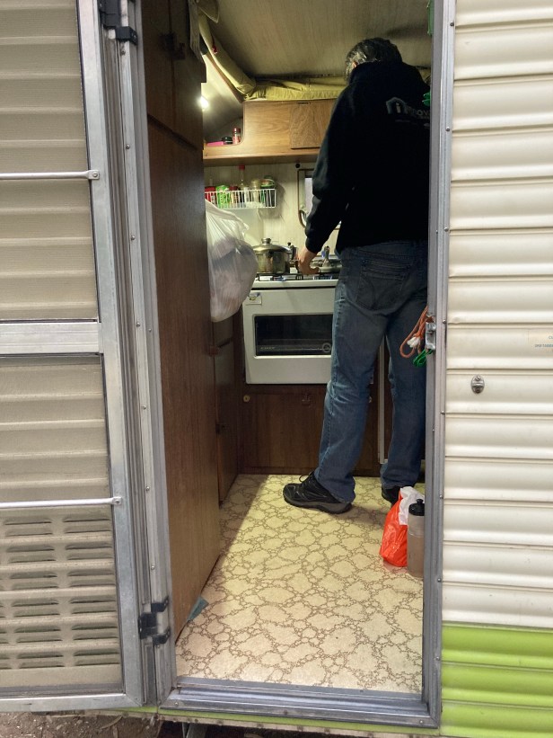 Mr Wanderer cooking our tea. He’s fussy as so I prepped and left him to it.