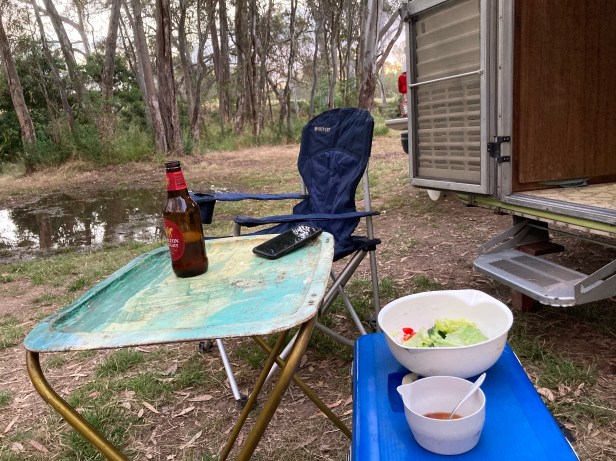 Had to ask for some cooking oil from the old man next door. In his haste he’s forgotten his salt, pepper, oil, tomato sauce, baking paper and so on. And yet he wouldn’t let me pack the caravan! I did offer. He declined.