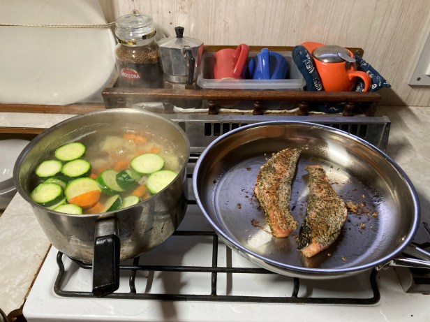 Dinner was salmon and 3 veg., potato, carrot and zucchini. And a salad with a simple soy dressing since there was nothing else. Make do with soy, squeeze of lime and some honey.