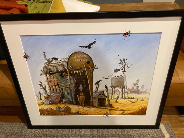 Mr Wanderer came back with my painting in tow. The wording reads Red Back Palace , Flammable gas and Beware the dog.