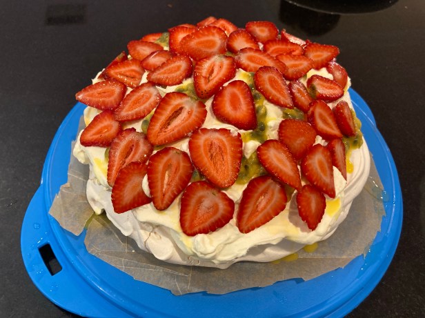 My sister baked my dad a Pav! It was his birthday on the weekend. That’s why I couldn’t follow Mr Wanderer to Echuca for the Baptism. I’d wanted to. If I had a car that would have been doable.