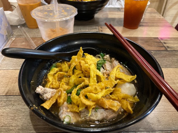 My kids and I tried out a new restaurant tonight where you pay $20 for a combo and you get a bowl of noodles, a pork skewer and a Thai milk tea.