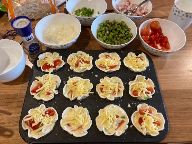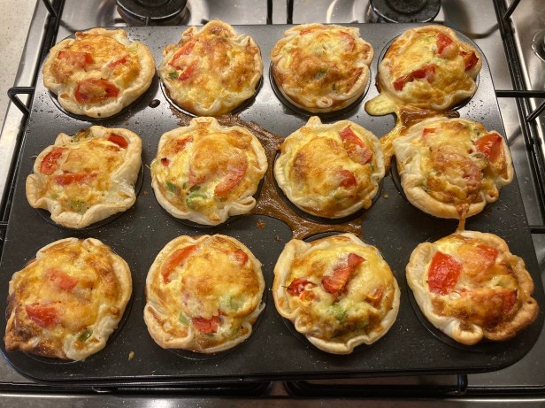 We sat down to lunch at 12pm. Mini Quiches that I microwaved and then into the oven to crisp. I also cut up some fruit for him to munch on the way.