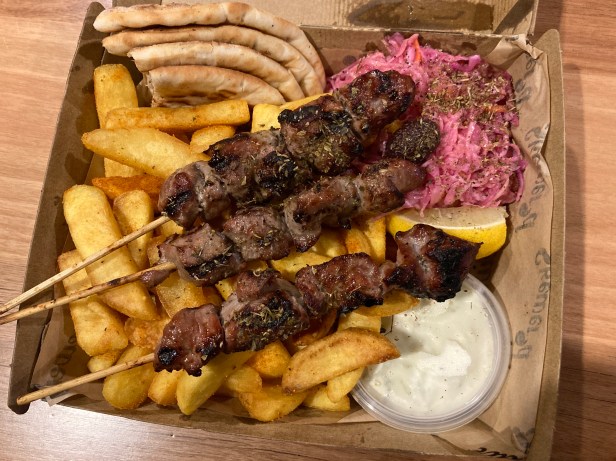 My dinner tonight! Greek! I only ate half of the bread, lamb and cabbage. Saving the rest for another meal.