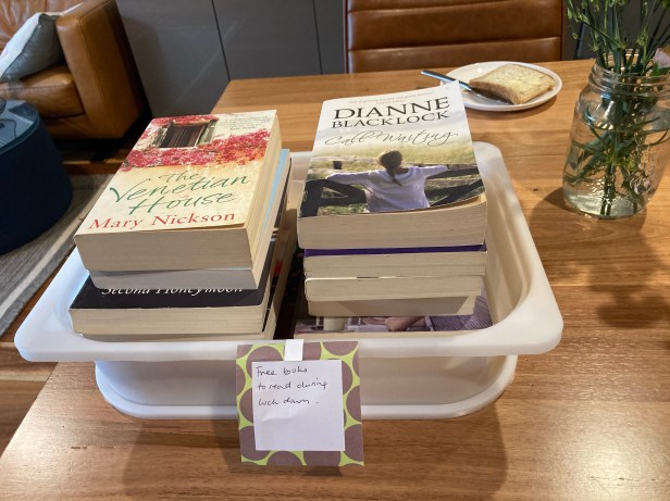 A while later? More books has appeared. People must have taken mine and replaced them with theirs. Every time I go by the foyer it’s a different set of books! Lovely to see.