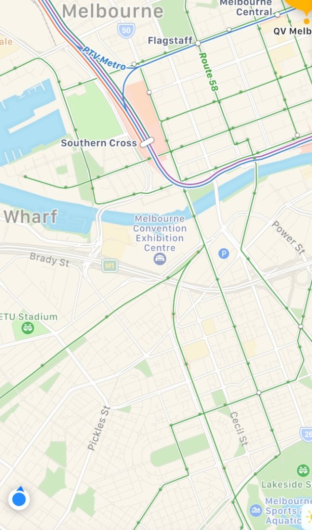 If I don’t feel like the tram I can catch a bus too. The bus services Bay St which is the white line you can see near to me (parallel to Pickles St). There’s a stop near Graham St (intersecting white line) thus very close to me and less distance to walk than the tram stop.