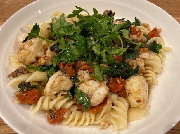 And me being good! I cooked dinner. Sea perch, olives, anchovies, cherry tomatoes, garlic, parsley, chilli flakes.
