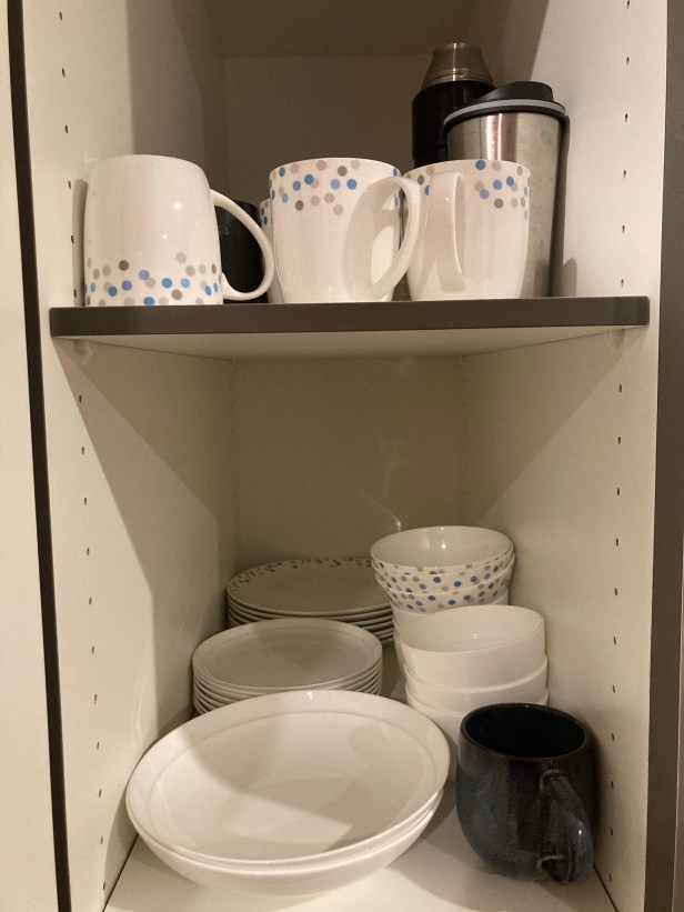 Came home yesterday to find he’s popped my dishes away. See all the cups right side up? It’s his doing! Also he didn’t know where to put my pasta plates so he had to balance the cereal bowls on top of my rice bowls. He’s also made the bed!