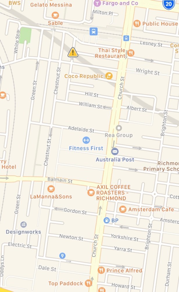 After Barkly we snaked up and then down again on the very last street before Church to the dead end and finally U turned to go on to Church.