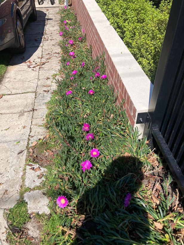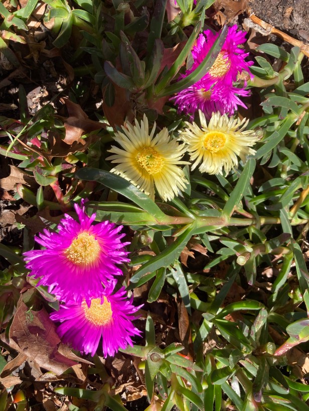 His pig faces are blooming. Last time I was there a few months ago I didn’t think they would do that well. For some reason there’s an odd one out! It’s yellow!