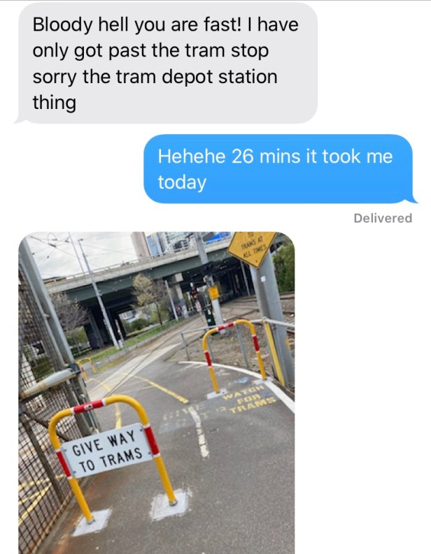 It turned out his meeting was at 12:30pm! We didn’t start riding back til 12:09pm. I took 28 minutes back as I got caught at the lights. I also had to walk my bike near the underpass.