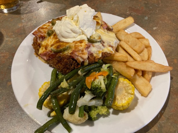 The pub meal was yummo! This was the Mex Parma! Jalapeños, salsa and sour cream on top!