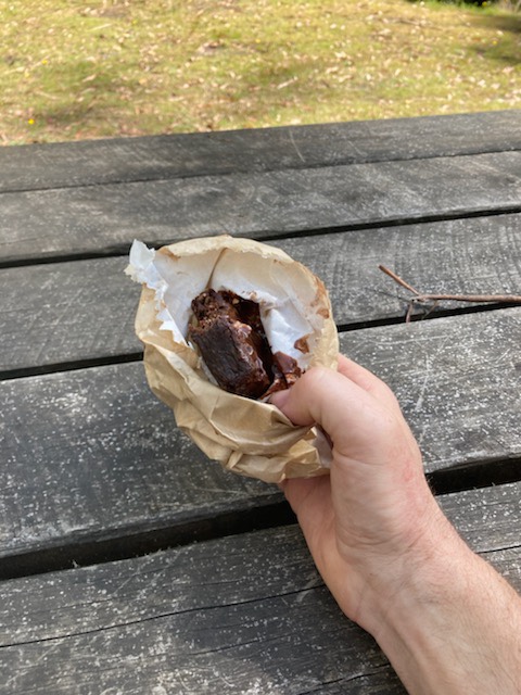 He sent me this! He ended up with a Frittata and sausage roll and coffee for lunch. Then took away some chocolate for the ride back. He managed to fill up his water bottle at the cafe.
