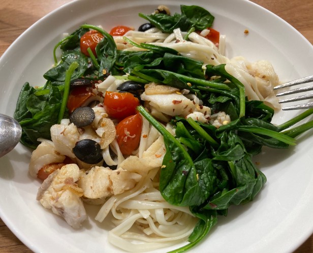 Sea perch in a garlicky, rum, anchovies, olives, cherry tomatoes and blanched spinach.