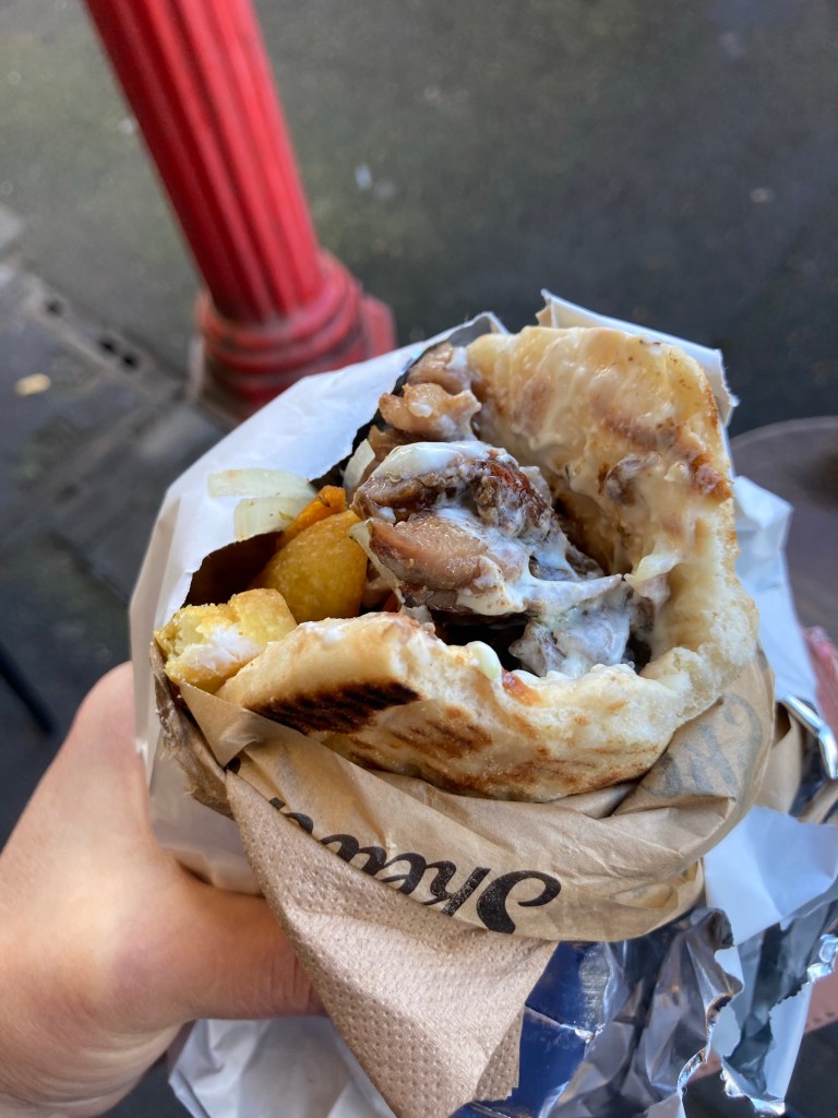 My one had lamb, tomatoes, onion, chips and garlic sauce.