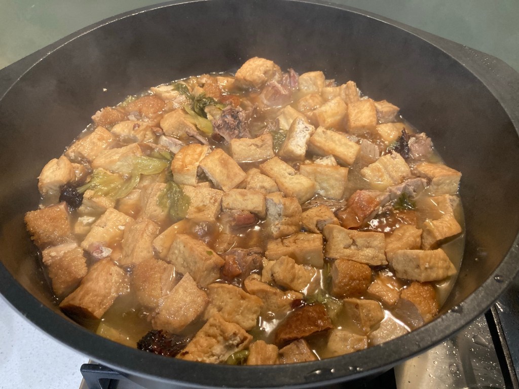 It’s very easy to make! 500g of roast pork, 1/2 a duck, 2 boxes of tofu fried and 2 bags of preserved mustard.