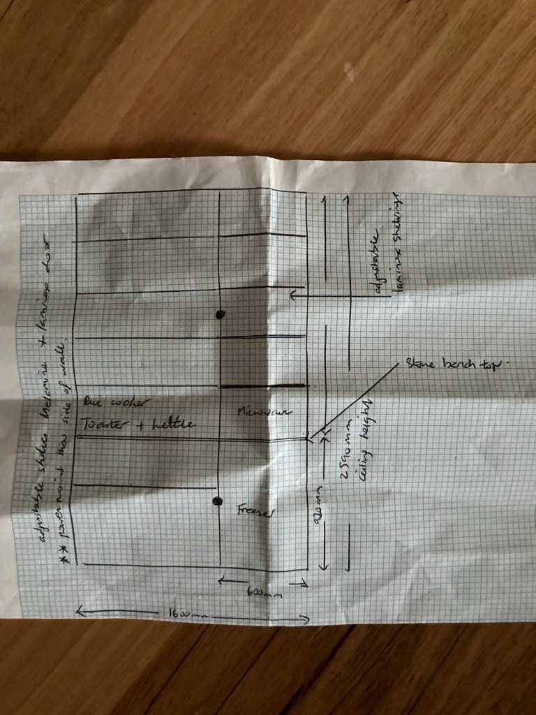 I’m thinking laminex. Open shelvings one end. The rest melamine with a door to hide the mess. She said she’ll get back to me early next week.